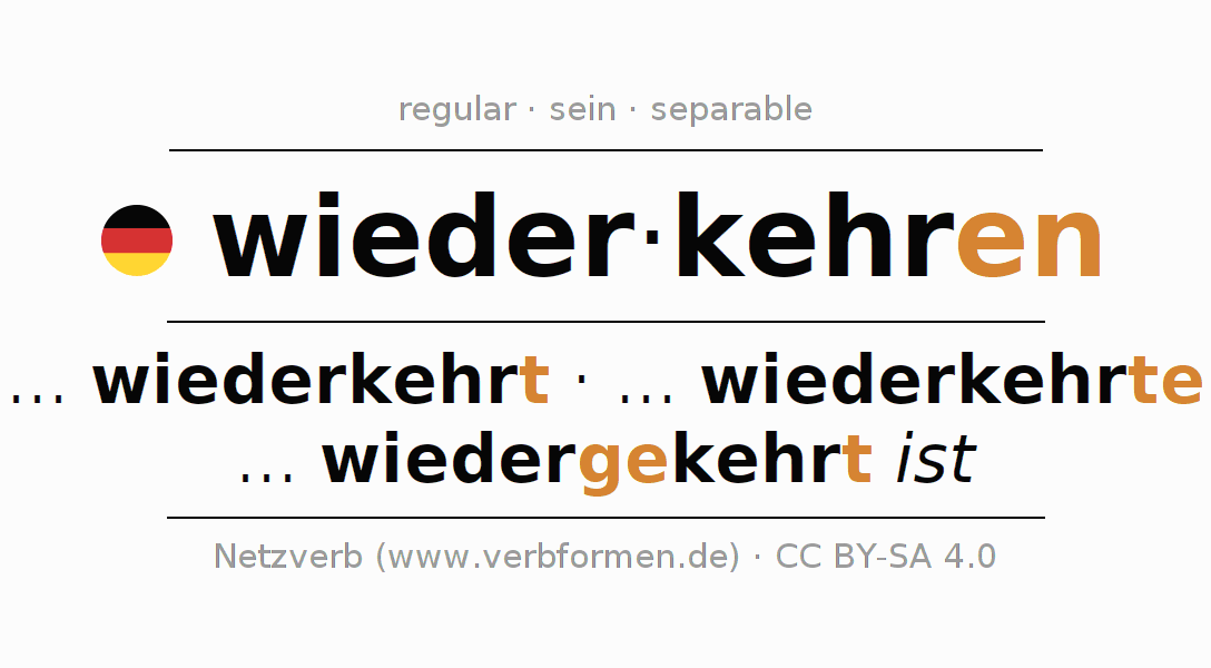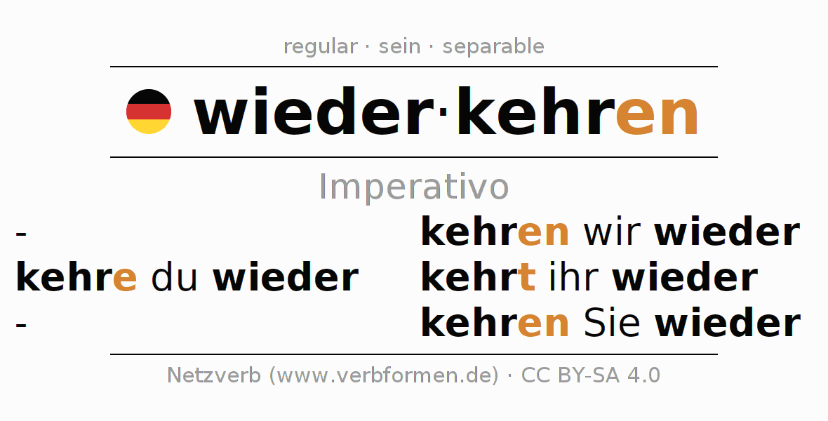 El verbo wiederkehren, conjugado completamente en todas las personas y números gramaticales en Imperativo Presente.