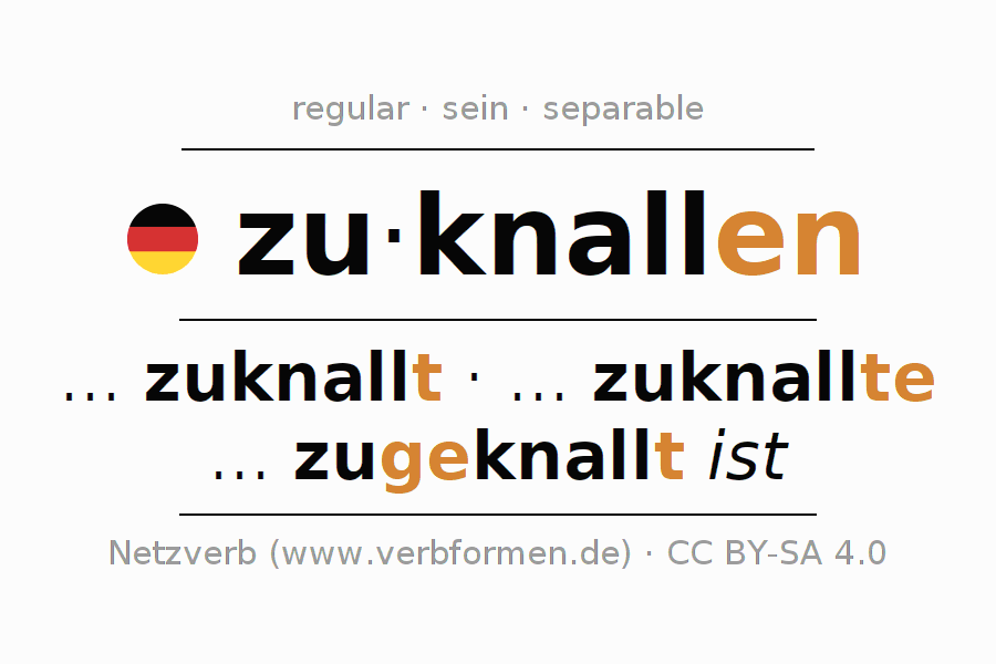 El verbo zuknallen (ist), conjugado completamente en todas las personas y números gramaticales en Imperativo Presente.
