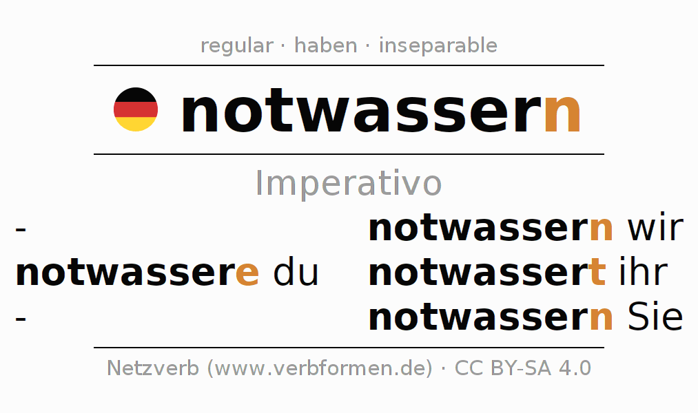 Este verbo notwassern (aterrizaje de emergencia) se conjuga en imperativo de la siguiente manera: notwass(e)re (du), notwassern wir, notwassert (ihr), notwassern Sie