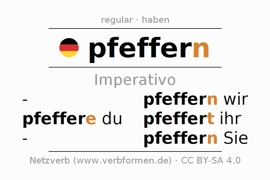 Este verbo pfeffern (arrojar, echar pimienta) se conjuga en imperativo de la siguiente manera: pfeff(e)re (du), pfeffern wir, pfeffert (ihr), pfeffern Sie