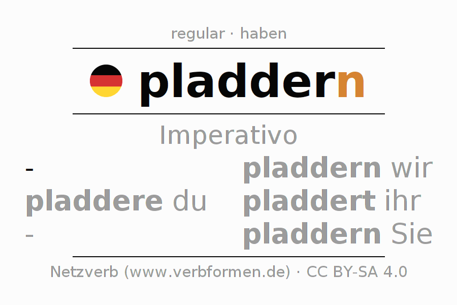 El verbo pladdern, conjugado completamente en todas las personas y números gramaticales en Imperativo Presente.