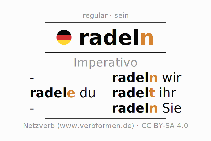 El verbo radeln, conjugado completamente en todas las personas y números gramaticales en Imperativo Presente.