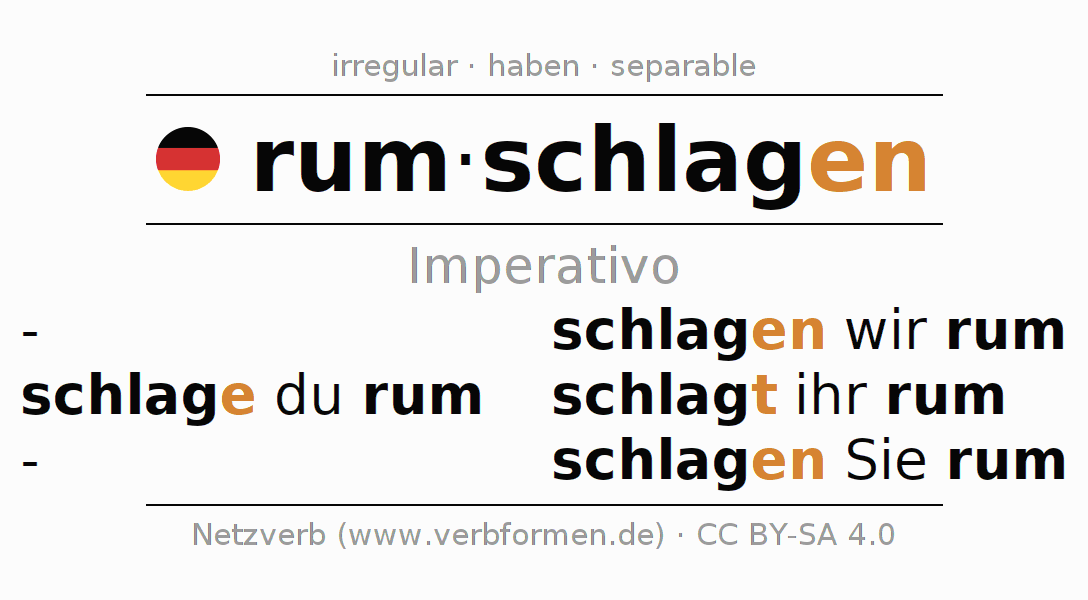 El verbo rumschlagen, conjugado completamente en todas las personas y números gramaticales en Imperativo Presente.
