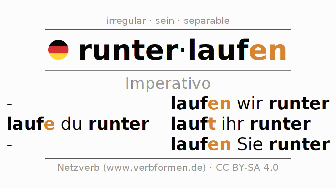 Este verbo runterlaufen (bajar, bajar corriendo) se conjuga en imperativo de la siguiente manera: laufe (du) runter, laufen wir runter, lauft (ihr) runter, laufen Sie runter
