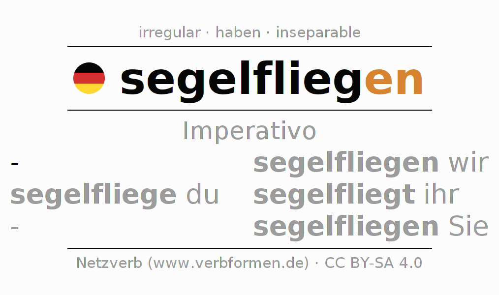 Este verbo segelfliegen (volar a vela, vuelo en planeador) se conjuga en imperativo de la siguiente manera: segelfliege (du), segelfliegen wir, segelfliegt (ihr), segelfliegen Sie