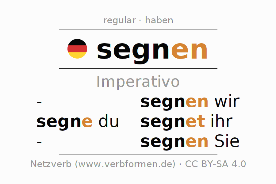 Este verbo segnen (bendecir, dar la bendición) se conjuga en imperativo de la siguiente manera: segne (du), segnen wir, segnet (ihr), segnen Sie
