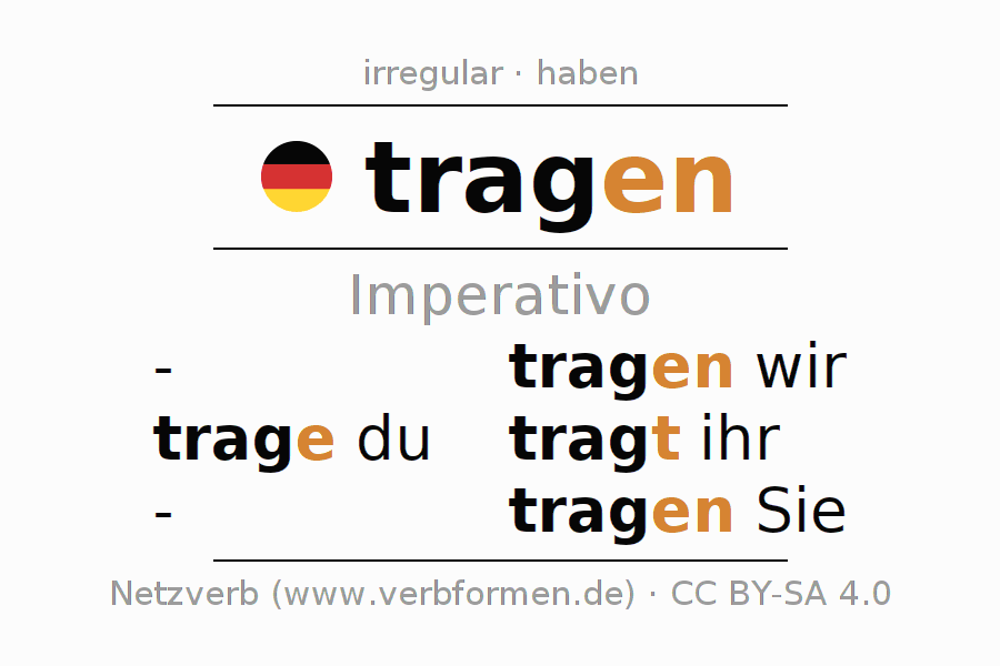Este verbo tragen (llevar, llevar puesto) se conjuga en imperativo de la siguiente manera: trage (du), tragen wir, tragt (ihr), tragen Sie