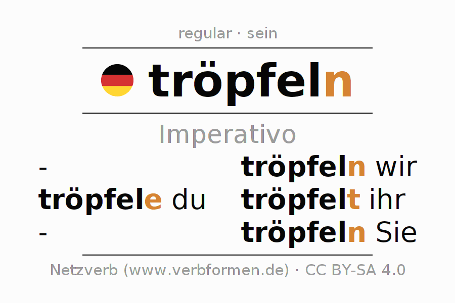 Este verbo tröpfeln (gotear, chorrear) se conjuga en imperativo de la siguiente manera: tröpf(e)le (du), tröpfeln wir, tröpfelt (ihr), tröpfeln Sie