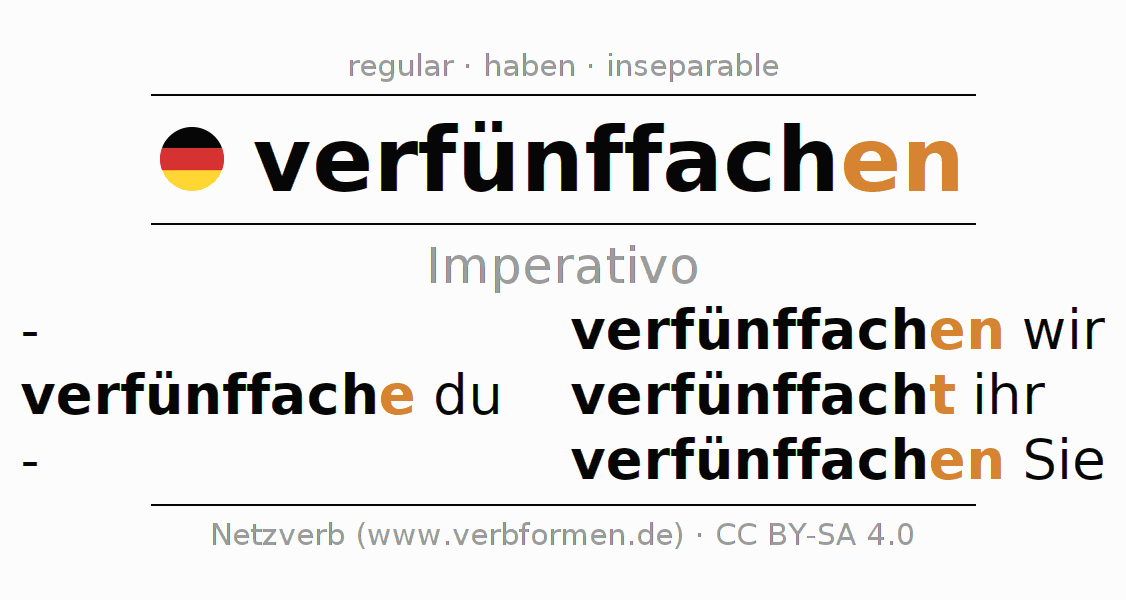 El verbo verfünffachen, conjugado completamente en todas las personas y números gramaticales en Imperativo Presente.