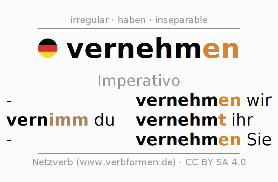 Este verbo vernehmen (interrogar, oír) se conjuga en imperativo de la siguiente manera: vernimm (du), vernehmen wir, vernehmt (ihr), vernehmen Sie