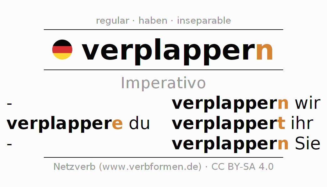 El verbo verplappern, conjugado completamente en todas las personas y números gramaticales en Imperativo Presente.