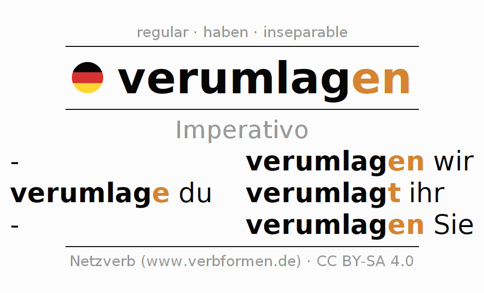 Este verbo verumlagen (redistribuir costos) se conjuga en imperativo de la siguiente manera: verumlage (du), verumlagen wir, verumlagt (ihr), verumlagen Sie
