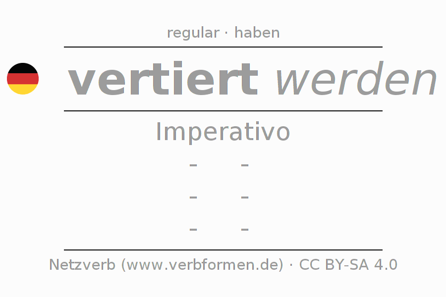 La conjugación de vertieren en Imperativo Presente Imperativo Pasivo procesivo es -, -, -, -.Para construir esta formas se requiere seguir algunas reglas gramaticales y también las especificaciones para la conjugación de verbos simples de vertieren en Imperativo . Comentarios ☆