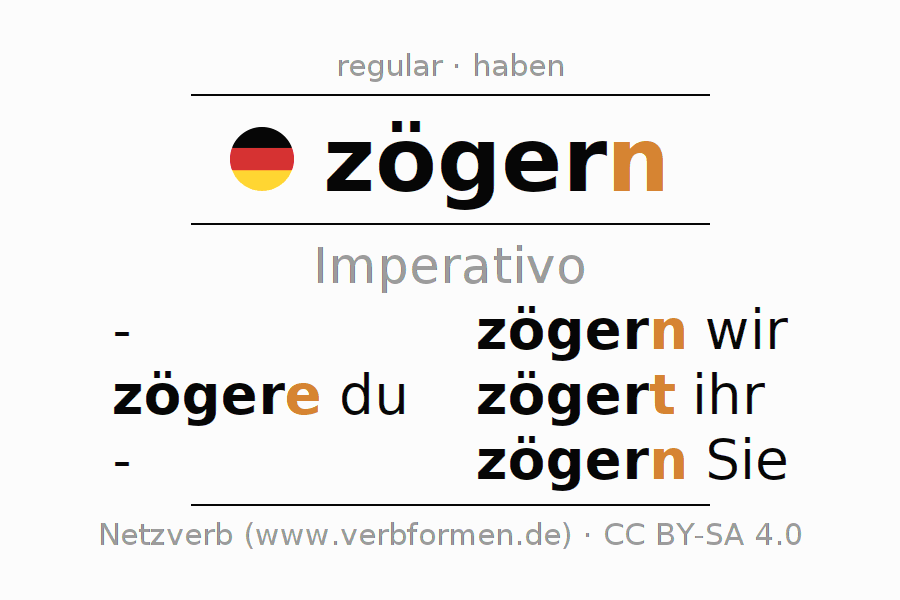 Este verbo zögern (vacilar, dudar) se conjuga en imperativo de la siguiente manera: zög(e)re (du), zögern wir, zögert (ihr), zögern Sie
