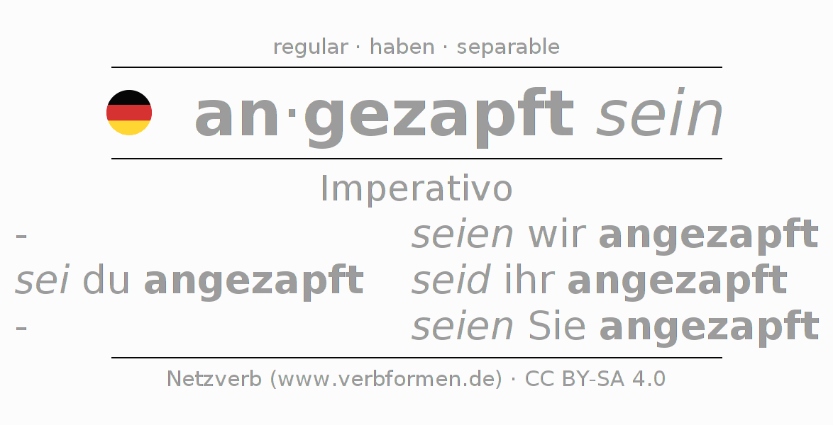 El verbo anzapfen, conjugado completamente en todas las personas y números gramaticales en Imperativo Presente.