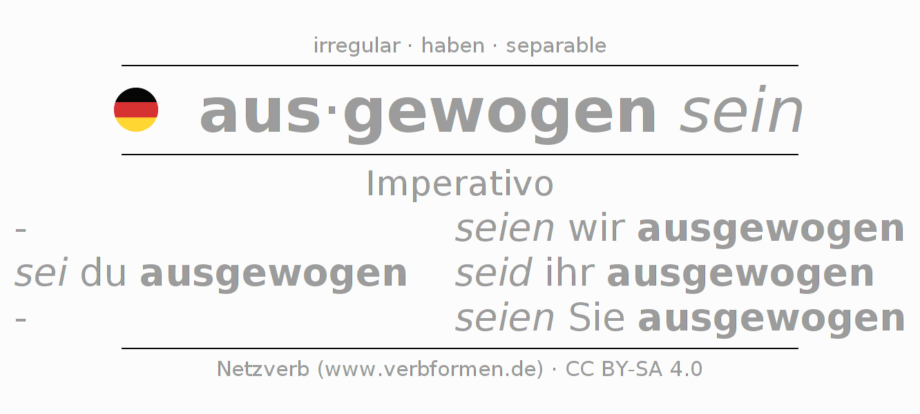 La conjugación de auswiegen en Imperativo Presente Imperativo Pasivo situativo es sei (du) ausgewogen, seien wir ausgewogen, seid (ihr) ausgewogen, seien Sie ausgewogen.Para construir esta formas se requiere seguir algunas reglas gramaticales y también las especificaciones para la conjugación de verbos simples de auswiegen en Imperativo . Comentarios ☆