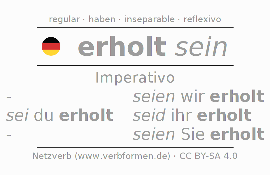 El verbo sich erholen, conjugado completamente en todas las personas y números gramaticales en Imperativo Presente.