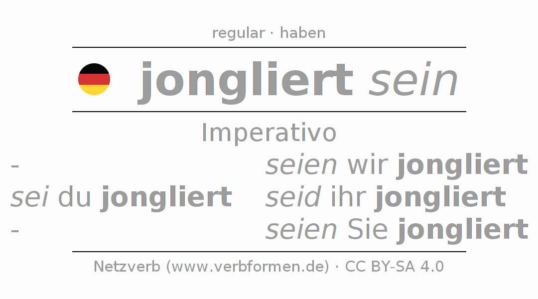 El verbo jonglieren, conjugado completamente en todas las personas y números gramaticales en Imperativo Presente.