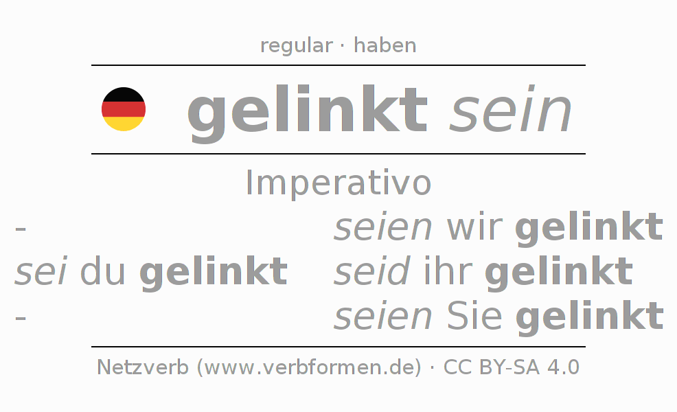 La conjugación de linken en Imperativo Presente Imperativo Pasivo situativo es sei (du) gelinkt, seien wir gelinkt, seid (ihr) gelinkt, seien Sie gelinkt.Para construir esta formas se requiere seguir algunas reglas gramaticales y también las especificaciones para la conjugación de verbos simples de linken en Imperativo . Comentarios ☆
