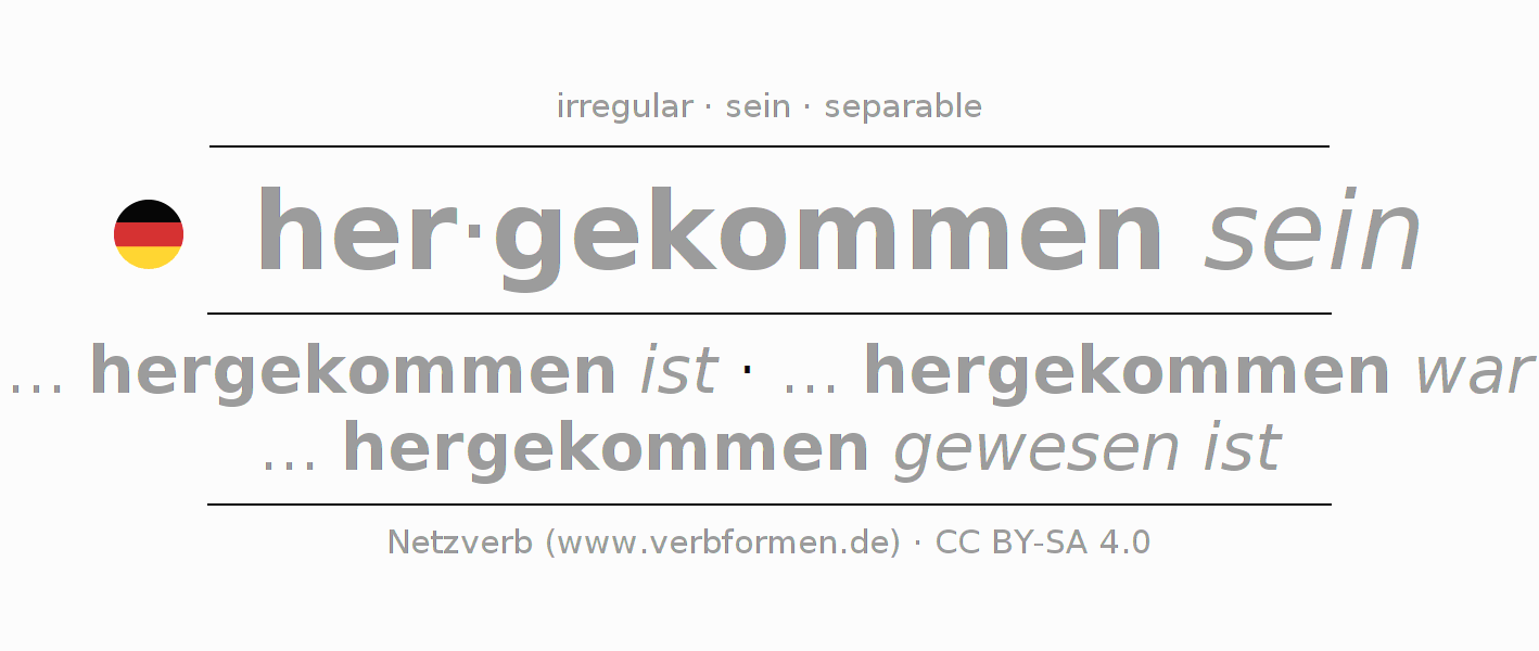 La conjugación de herkommen en Imperativo Presente Imperativo Pasivo situativo es sei (du) hergekommen, seien wir hergekommen, seid (ihr) hergekommen, seien Sie hergekommen.Para construir esta formas se requiere seguir algunas reglas gramaticales y también las especificaciones para la conjugación de verbos simples de herkommen en Imperativo . Comentarios ☆