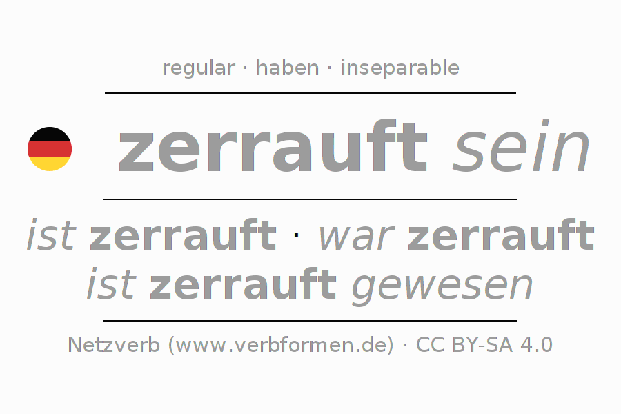 La conjugación de zerraufen en Imperativo Presente Imperativo Pasivo situativo es sei (du) zerrauft, seien wir zerrauft, seid (ihr) zerrauft, seien Sie zerrauft.Para construir esta formas se requiere seguir algunas reglas gramaticales y también las especificaciones para la conjugación de verbos simples de zerraufen en Imperativo . Comentarios ☆