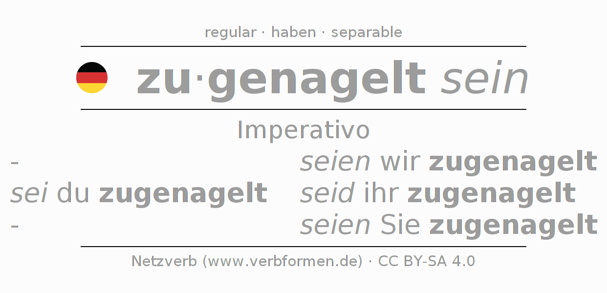 La conjugación de zunageln en Imperativo Presente Imperativo Pasivo situativo es sei (du) zugenagelt, seien wir zugenagelt, seid (ihr) zugenagelt, seien Sie zugenagelt.Para construir esta formas se requiere seguir algunas reglas gramaticales y también las especificaciones para la conjugación de verbos simples de zunageln en Imperativo . Comentarios ☆