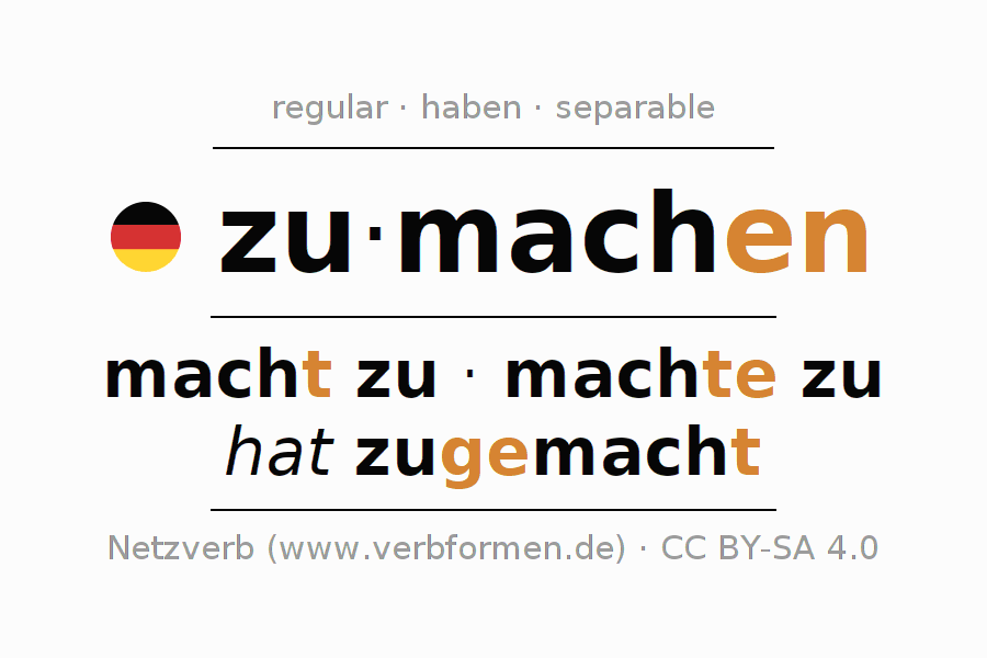 Este verbo zumachen (cerrar, darse prisa) se conjuga en imperativo de la siguiente manera: mache (du) zu, machen wir zu, macht (ihr) zu, machen Sie zu