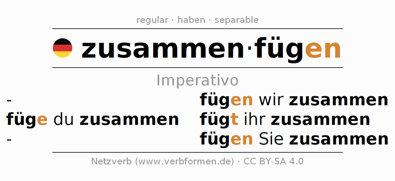 Este verbo zusammenfügen (ensamblar, unir) se conjuga en imperativo de la siguiente manera: füge (du) zusammen, fügen wir zusammen, fügt (ihr) zusammen, fügen Sie zusammen