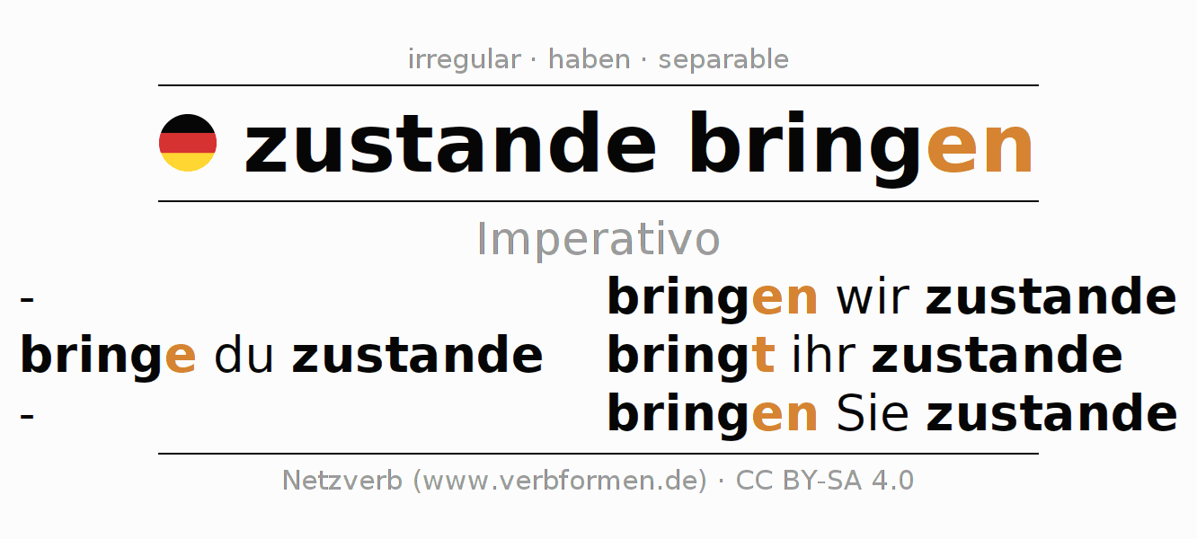 Este verbo zustandebringen (realizar, llevar a efecto) se conjuga en imperativo de la siguiente manera: bringe (du) zustande, bringen wir zustande, bringt (ihr) zustande, bringen Sie zustande