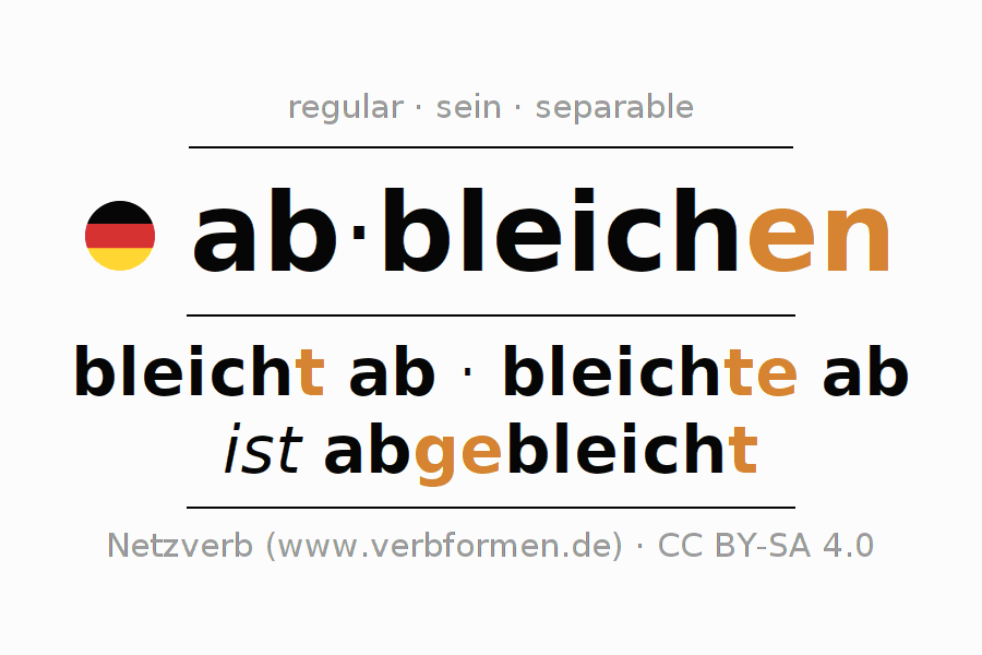 Este verbo abbleichen (apagarse, blanquear) se conjuga en presente de la siguiente manera: ich bleiche ab, du bleichst ab, er bleicht ab, wir bleichen ab, ihr bleicht ab, sie bleichen ab