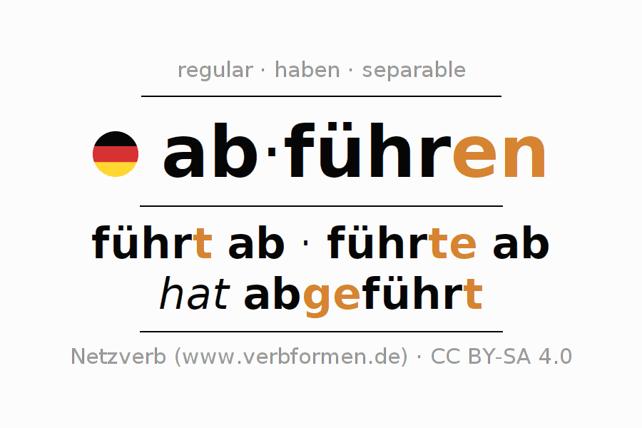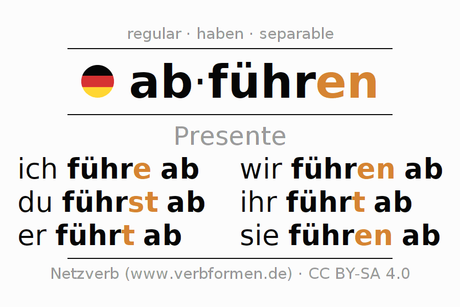 Este verbo abführen (evacuar, pagar) se conjuga en presente de la siguiente manera: ich führe ab, du führst ab, er führt ab, wir führen ab, ihr führt ab, sie führen ab