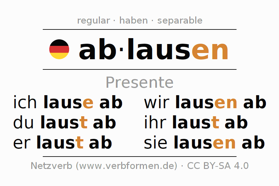 Este verbo ablausen (despiojar) se conjuga en presente de la siguiente manera: ich lause ab, du laust ab, er laust ab, wir lausen ab, ihr laust ab, sie lausen ab
