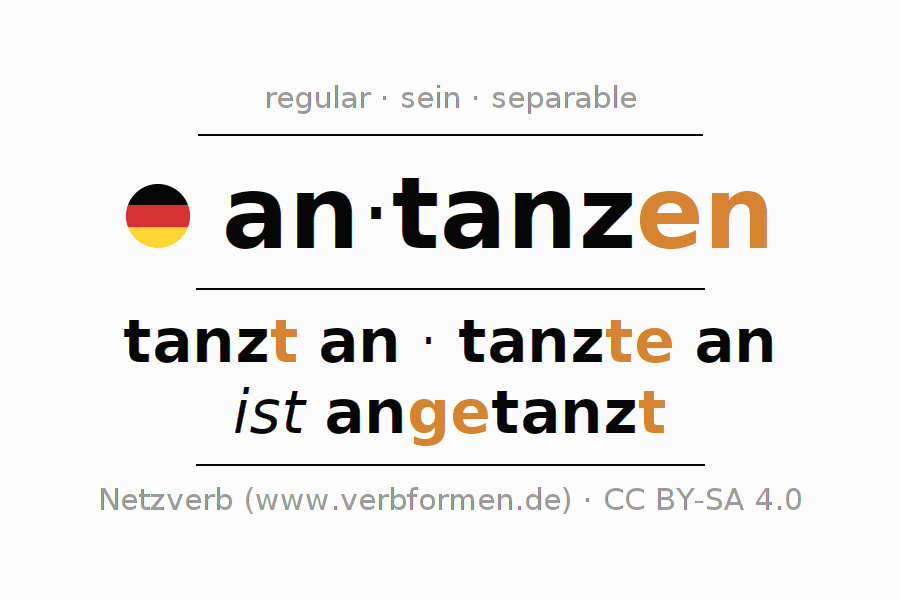 Este verbo antanzen (aparecer, acercarse bailando) se conjuga en presente de la siguiente manera: ich tanze an, du tanzt an, er tanzt an, wir tanzen an, ihr tanzt an, sie tanzen an