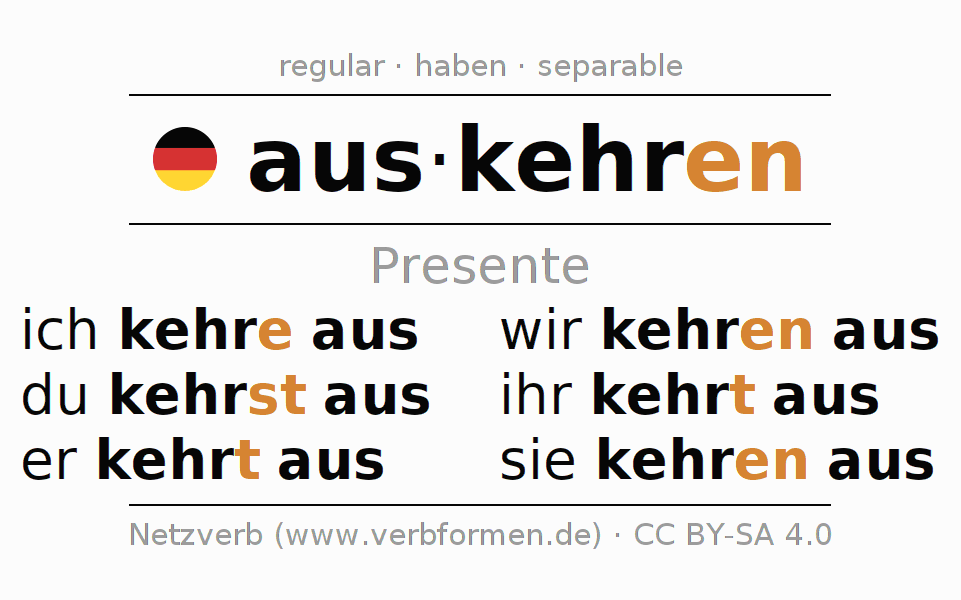 Este verbo auskehren (barrer, abonar) se conjuga en presente de la siguiente manera: ich kehre aus, du kehrst aus, er kehrt aus, wir kehren aus, ihr kehrt aus, sie kehren aus
