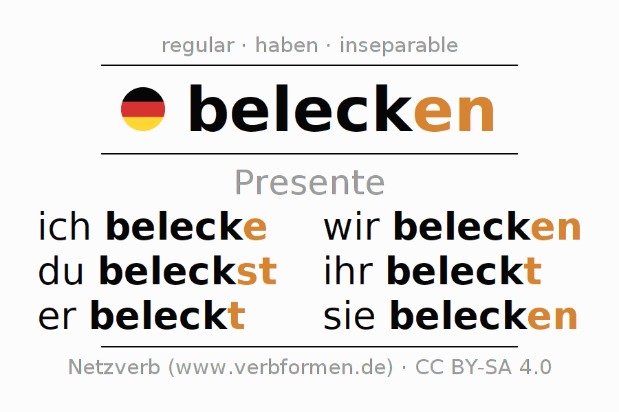 El verbo belecken, conjugado completamente en todas las personas y números gramaticales en Presente Indicativo.