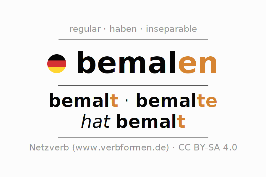 El verbo bemalen, conjugado completamente en todas las personas y números gramaticales en Presente Indicativo.