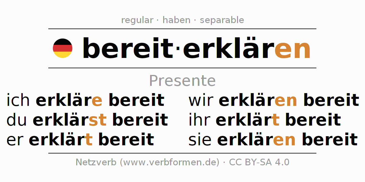 El verbo bereiterklären, conjugado completamente en todas las personas y números gramaticales en Presente Indicativo.