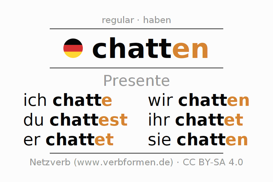 Este verbo chatten (chatear, chatear con alguien) se conjuga en presente de la siguiente manera: ich chatte, du chattest, er chattet, wir chatten, ihr chattet, sie chatten