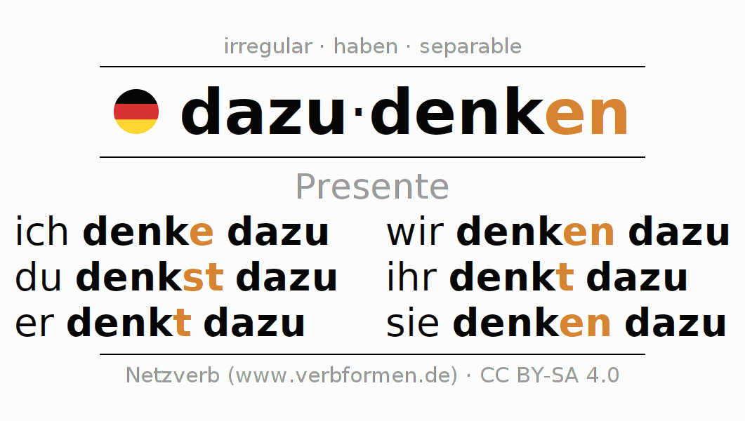 Este verbo dazudenken (considerar, imaginar) se conjuga en presente de la siguiente manera: ich denke dazu, du denkst dazu, er denkt dazu, wir denken dazu, ihr denkt dazu, sie denken dazu