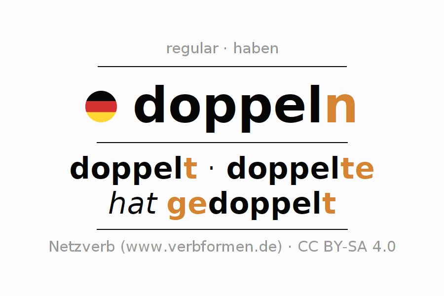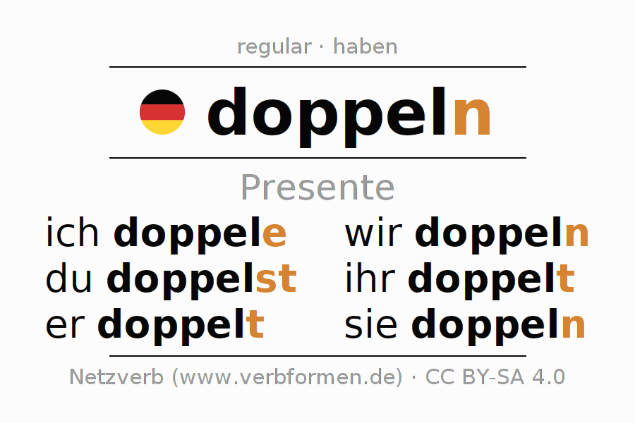 El verbo doppeln, conjugado completamente en todas las personas y números gramaticales en Presente Indicativo.