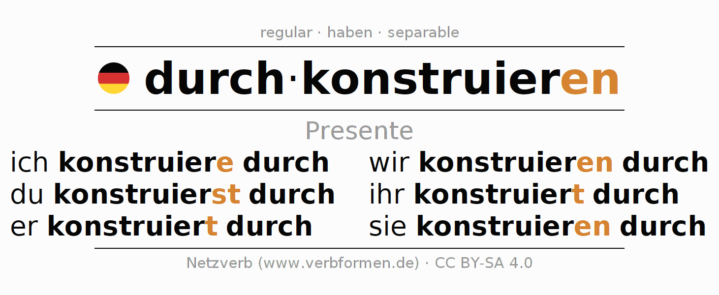 El verbo durchkonstruieren, conjugado completamente en todas las personas y números gramaticales en Presente Indicativo.