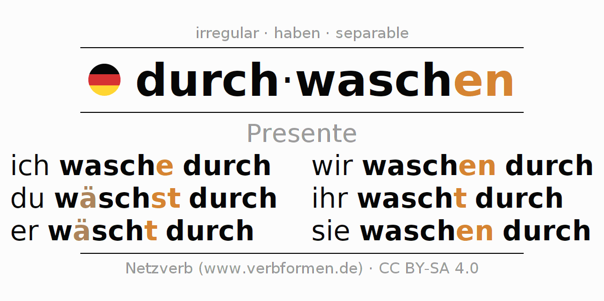 Este verbo durchwaschen (lavar, lavar bien) se conjuga en presente de la siguiente manera: ich wasche durch, du wäschst durch, er wäscht durch, wir waschen durch, ihr wascht durch, sie waschen durch
