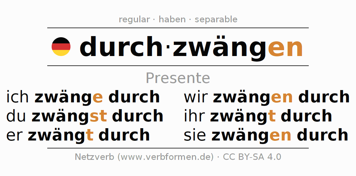 Este verbo durchzwängen (empujar, forzar) se conjuga en presente de la siguiente manera: ich zwänge durch, du zwängst durch, er zwängt durch, wir zwängen durch, ihr zwängt durch, sie zwängen durch