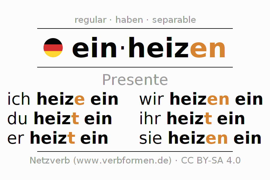Este verbo einheizen (calentar, animar) se conjuga en presente de la siguiente manera: ich heize ein, du heizt ein, er heizt ein, wir heizen ein, ihr heizt ein, sie heizen ein
