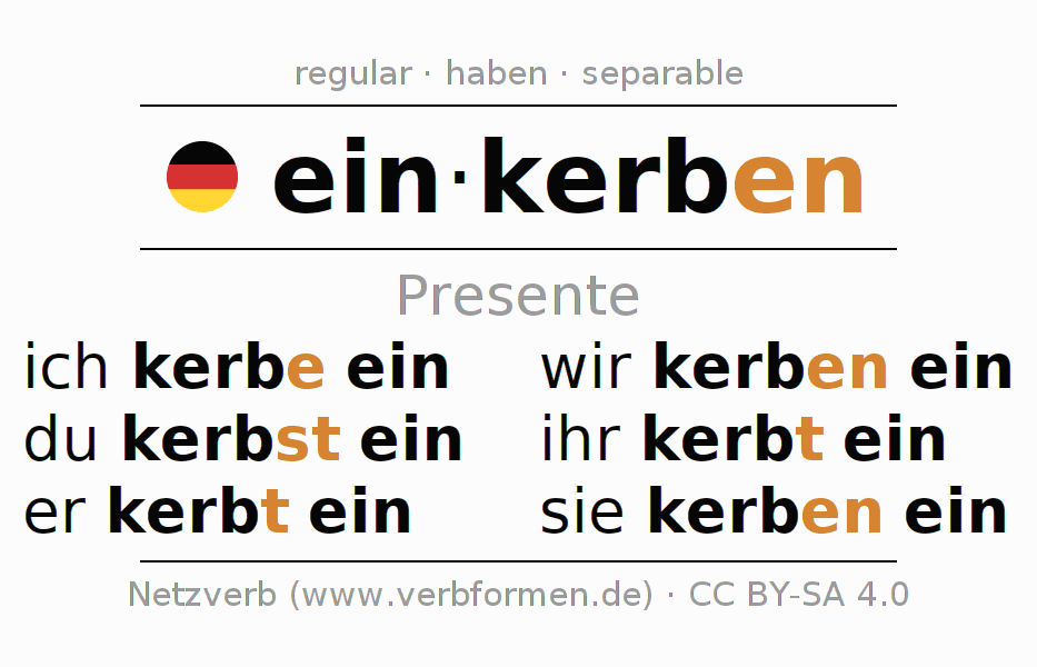 Este verbo einkerben (corte, entallar) se conjuga en presente de la siguiente manera: ich kerbe ein, du kerbst ein, er kerbt ein, wir kerben ein, ihr kerbt ein, sie kerben ein