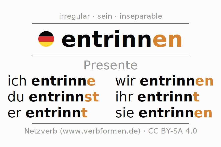Este verbo entrinnen (escapar, escaparse) se conjuga en presente de la siguiente manera: ich entrinne, du entrinnst, er entrinnt, wir entrinnen, ihr entrinnt, sie entrinnen