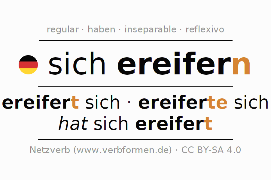 El verbo sich ereifern, conjugado completamente en todas las personas y números gramaticales en Presente Indicativo.