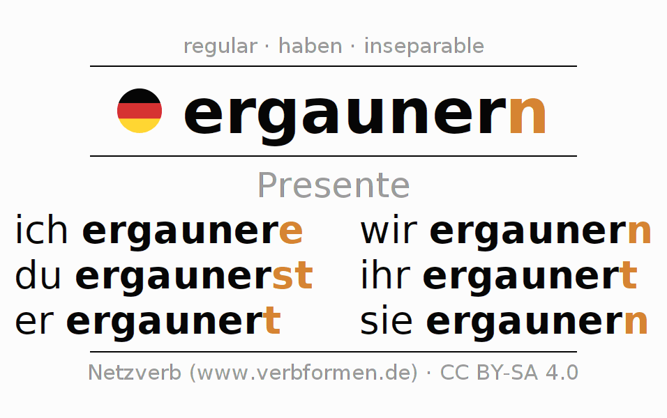 Este verbo ergaunern (estafar, defraudar) se conjuga en presente de la siguiente manera: ich ergaun(e)re, du ergaunerst, er ergaunert, wir ergaunern, ihr ergaunert, sie ergaunern