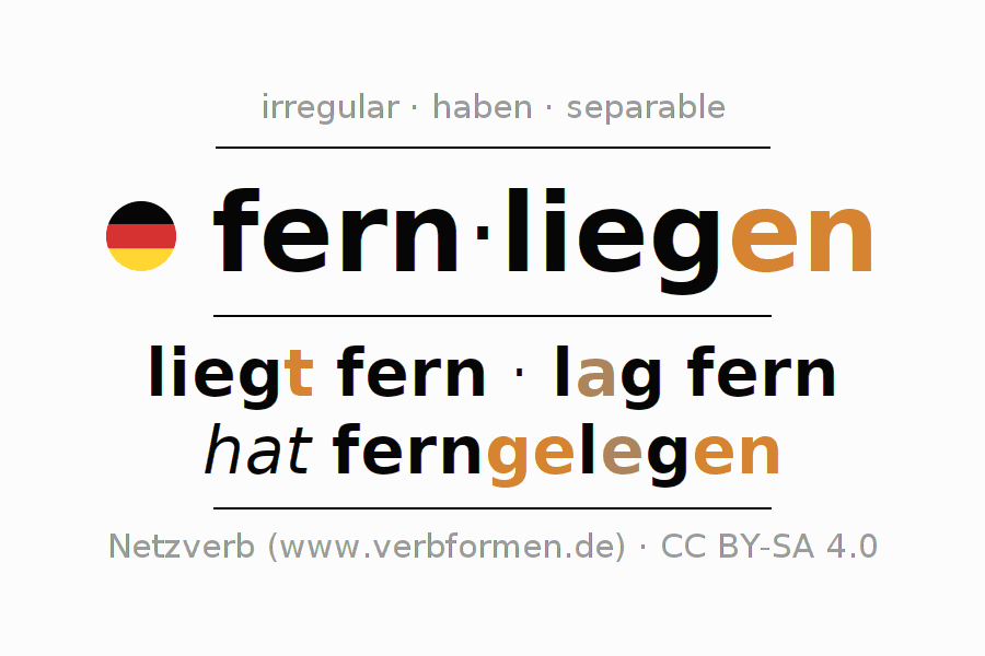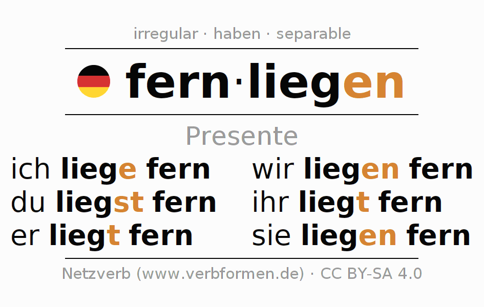 Este verbo fernliegen (estar lejos, no considerar) se conjuga en presente de la siguiente manera: ich liege fern, du liegst fern, er liegt fern, wir liegen fern, ihr liegt fern, sie liegen fern
