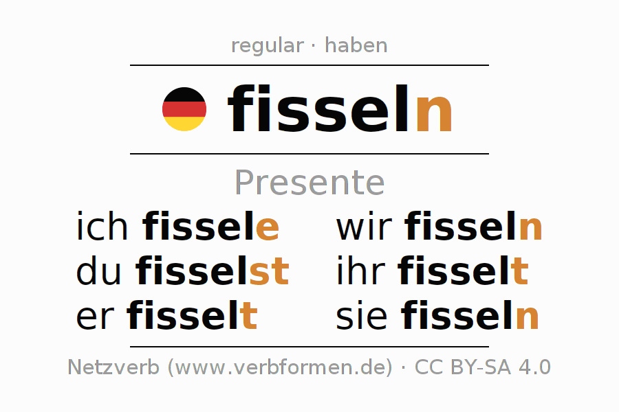 Este verbo fisseln (lloviznar, nevisnar) se conjuga en presente de la siguiente manera: ich fiss(e)le, du fisselst, er fisselt, wir fisseln, ihr fisselt, sie fisseln